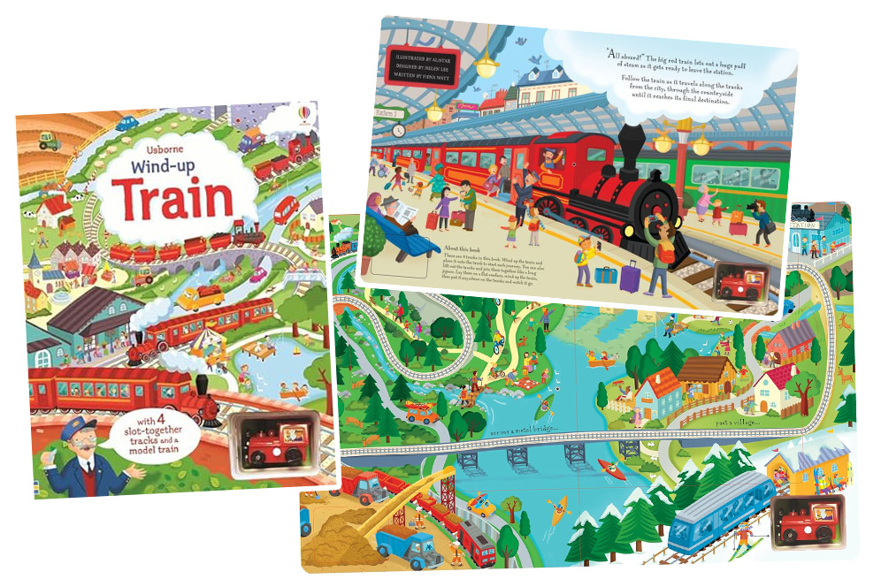 Children love to interact with the book thanks to the toy wind-up locomotive. Children can wind up the train and put it on the tracks to see how it rushes through the city, over the mountains, and along the rivers until it reaches the railway museum. The tracks can be built into the pages of the book or connected together to make one large railway track.