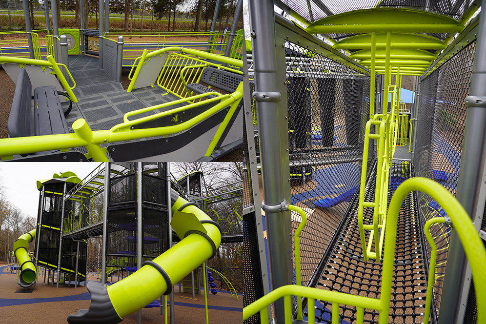 The playground is divided into four “zones” rotating around a central carousel. The playground includes a picnic pavilion and rest areas with restrooms. The main parking and drop-off area is near the park entrance, and additional parking is available across from Langley Fork Park.